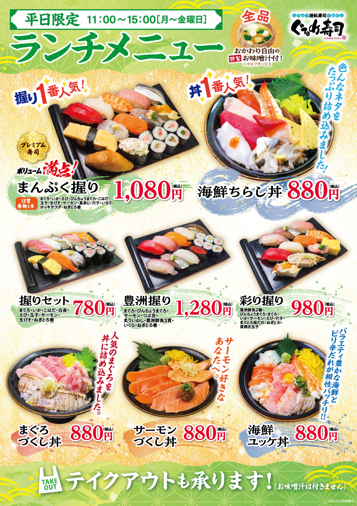 旨い回転寿司ぐるめ寿司、マグロが自慢のワンランク上の回転寿司です。旨い回転寿司ぐるめ寿司 マグロが自慢のワンランク上の回転寿司です。Navigation Home 今月のおすすめ 店内メニュー お持ち帰りメニュー 店舗のご案内 新型コロナウイルス感染拡大により、営業時間・定休日が記載と異なる場合がございます。ご来店時は事前に店舗へご確認ください。 また、このたび緊急事態宣言を受けまして、新型コロナウイルス感染拡大防止の為、酒類の提供を自粛いたします。 皆さまにはご迷惑をおかけしますが、どうぞご理解賜りますようお願い申しあげます。 2025年12月8日 NEW! 冬の創作寿司 2025年12月1日 12月は「鱈!」 2025年11月1日 11月は「サーモンフェア!」 2025年10月1日 10月のおすすめは「ばちまぐろとろ」 2025年9月18日 秋の創作寿司 12月は「鱈!」2025年12月01日冬の創作寿司2025年12月08日平日【月〜金曜日】11:00〜15:00まで丼も握りも大満足のランチメニュー。数量限定ですお早めに!!全品おかわり自由の特製お味噌汁つき(セルフサービス)イートイン消費税10%ですが、テイクアウトは消費税8%ですがどちらも同一価格でがんばります!全国から仕入れた産地直送の鮮魚を使った握りをテイクアウトでご自宅でもお楽しみください!>詳しくはコチラお近くのぐるめ寿司へ是非お越し下さい!鶴見市場店横浜市鶴見区市場大和町4-1Tel.045-504-2828営業時間11:00~22:00(LO21:45)※2023年6月現在追分店川崎市川崎区大島1-17-14Tel.044-246-4617営業時間11:00~22:00(LO21:45)※2023年6月現在