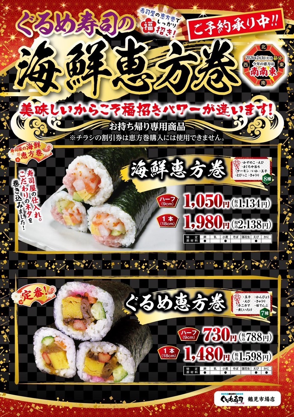 ぐるめ寿司鶴見市場店では、お寿司屋ならではの厳選ネタを贅沢に巻いた「恵方巻」のご予約を承っております。